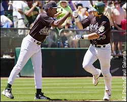 |  | | Ramon Hernandez rounds third after hitting the A's fourth HR of the game, a 3-run shot in the eighth. |