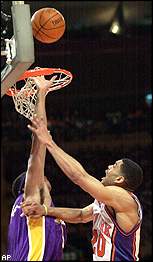 The Lakers' Devean George grabs hold of the rim as he tries to block Allan Houston's shot.