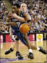 |  | | Terrell Brandon, who led the T-Wolves with 20 points, squeezes past Jason Williams. |