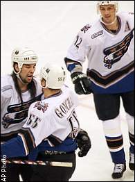 |  | | Washington's Chris Simon, left, and Peter Bondra, right, congratulate Sergei Gonchar after he scored the first of his three goals Tuesday night. |