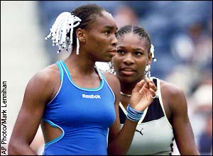 Venus Williams and her sister Serena talk during their doubles match against Amanda Coetzer and Ines Gorrochategui.